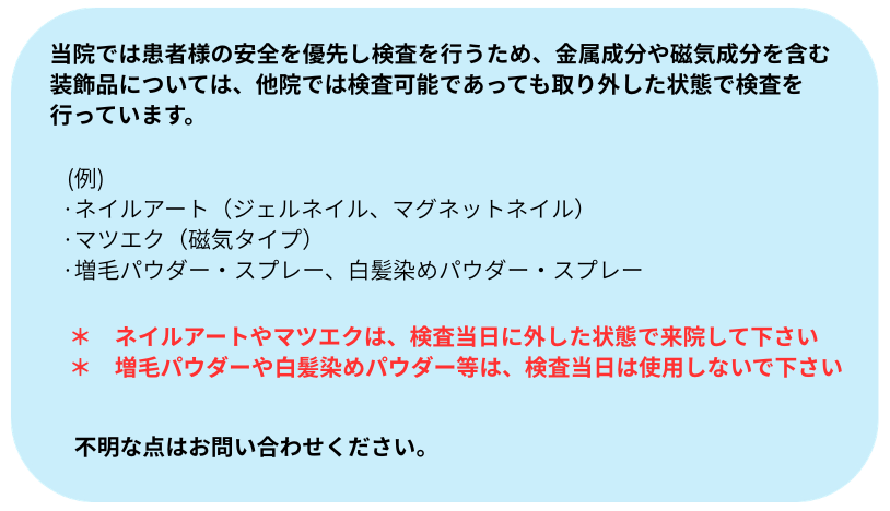 場合により金属のついていない服装または検査着に着替えていただきます。・身につけている金属類や張り薬・カイロ・コルセットを外してください。