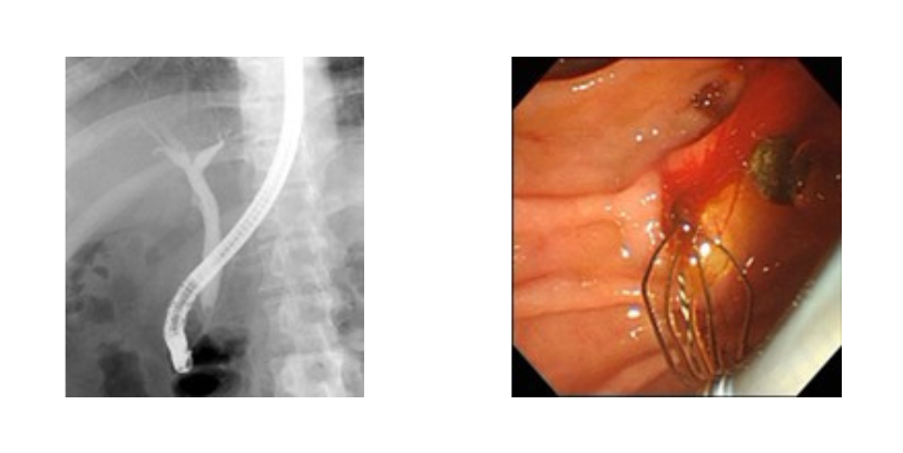 口から内視鏡を入れ、胆管や膵管にカテーテルを挿入し、造影剤を使用して胆管・膵管の異常を調べる検査です。検査に続いて胆汁や膵液を外に排出させる治療(ドレナージ治療)を行うことがあります。X線を連続的に照射し、リアルタイムで状態を確認しながら治療を行います。