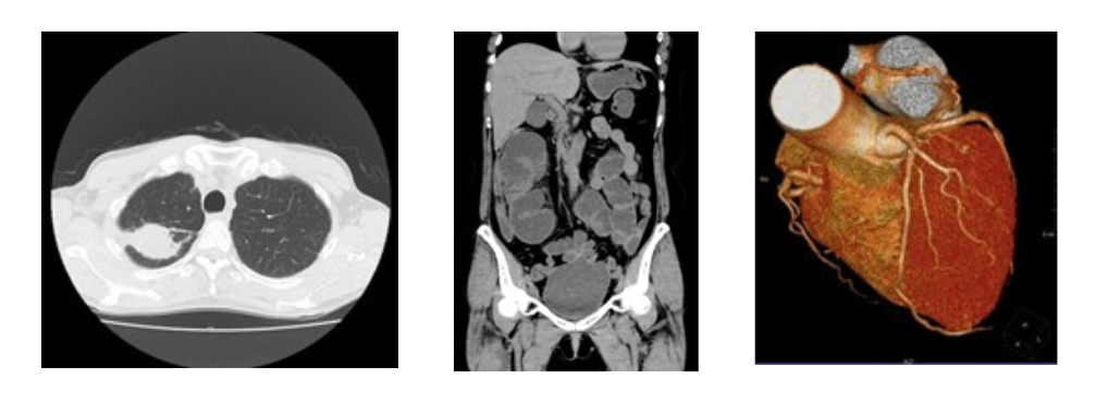 マルチスライスCTでは頭部・胸部・腹部・下肢など全身の撮影ができます。3次元の情報により様々な断面の画像や3D画像を作成することができます。これにより病変の描出もしやすくなり、「がん」などの早期発見にもつながります。