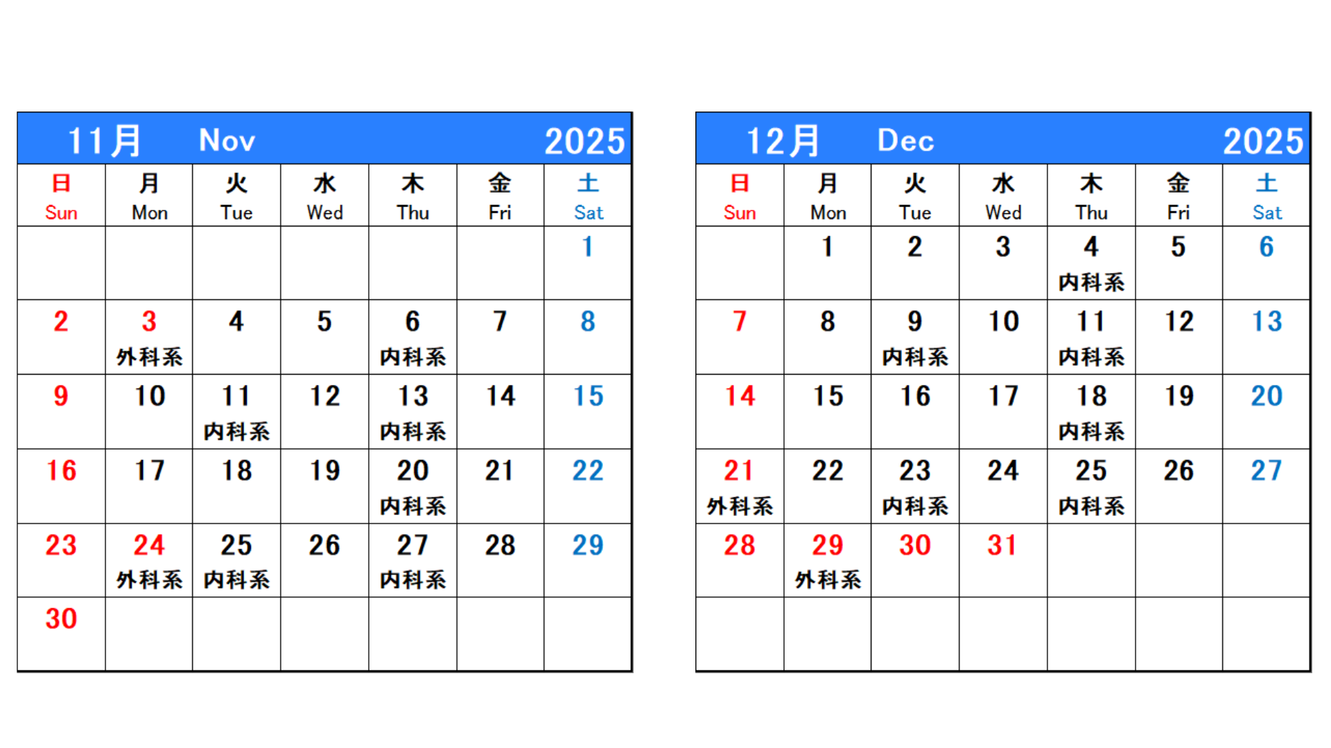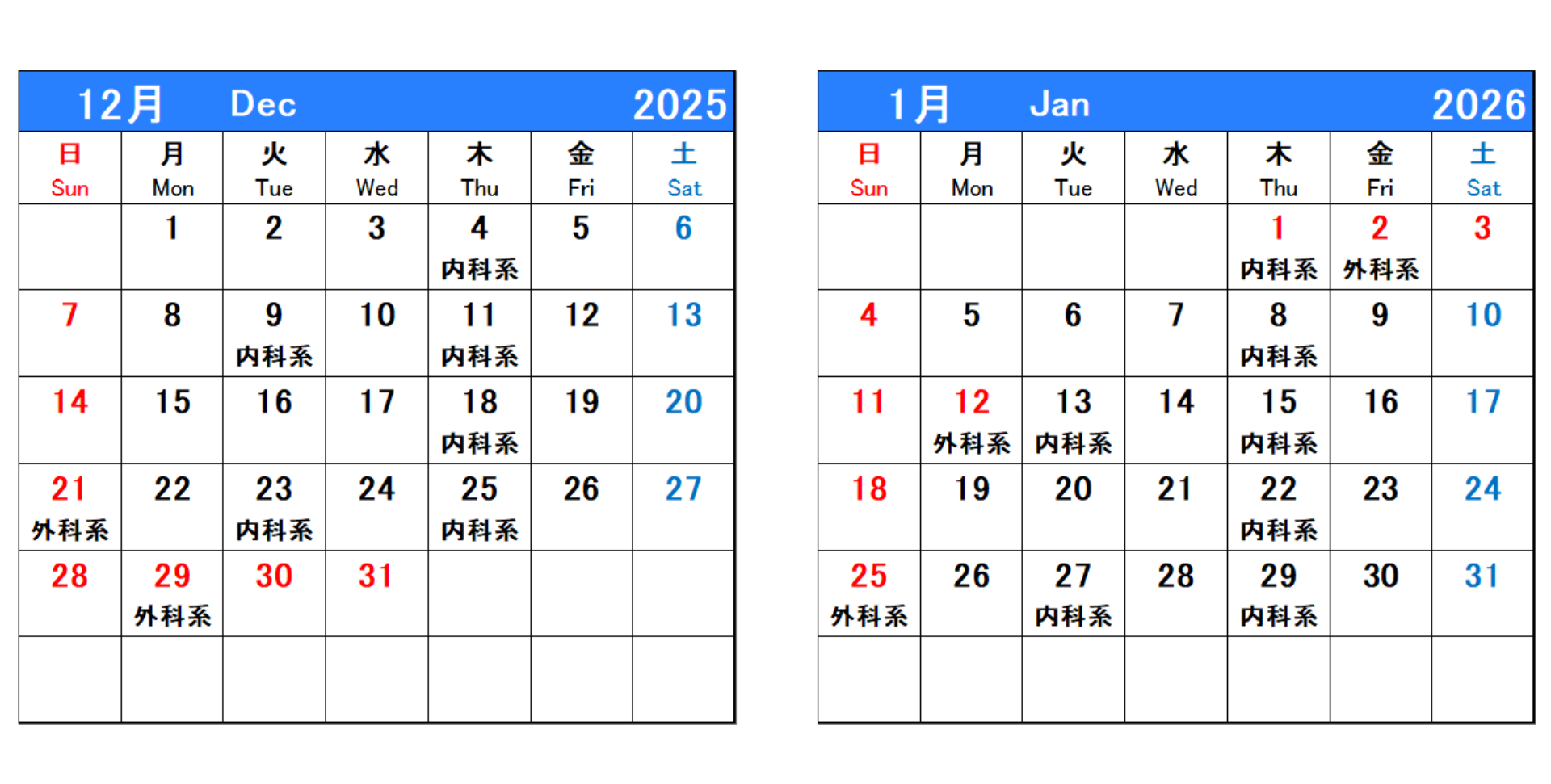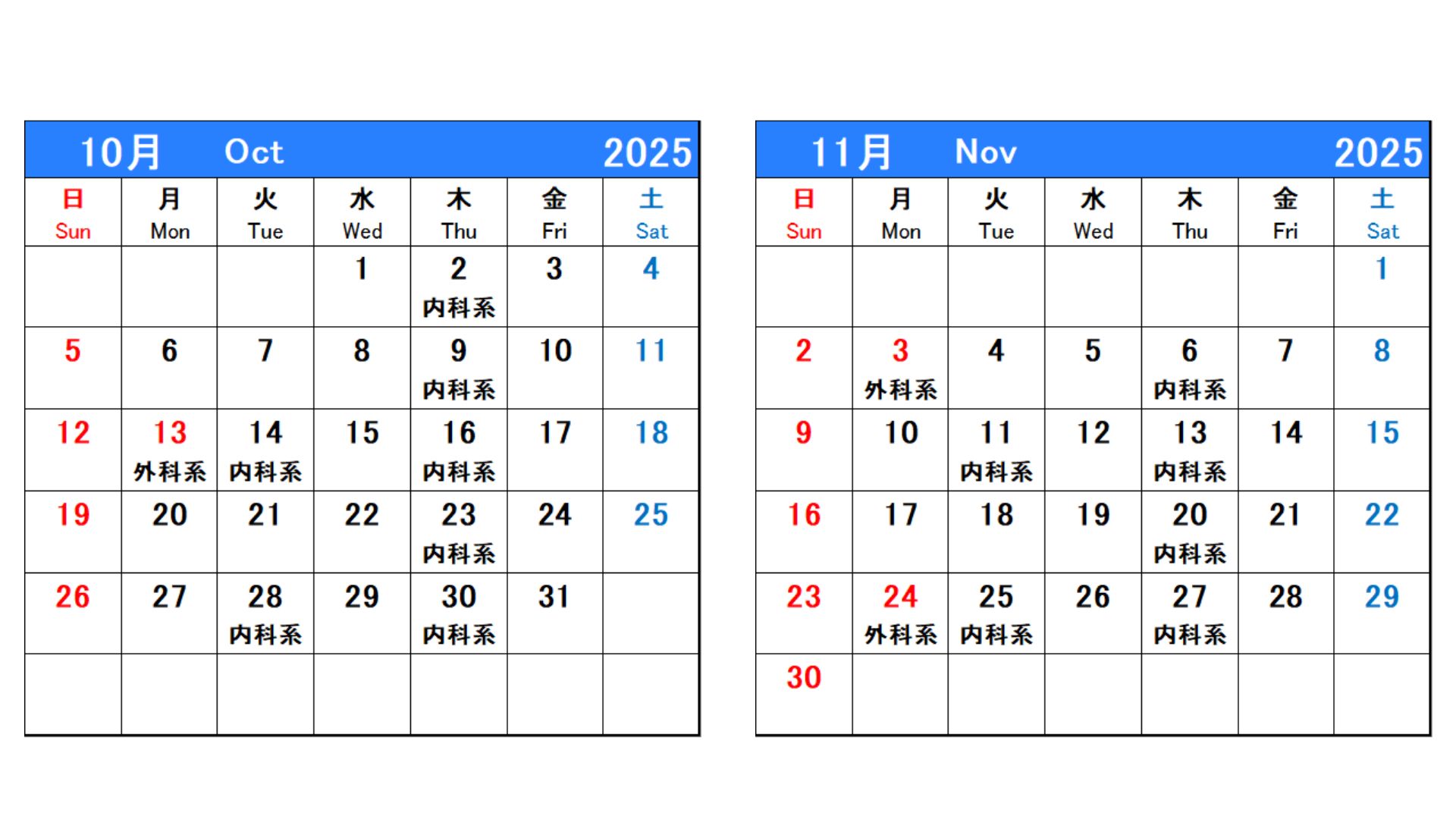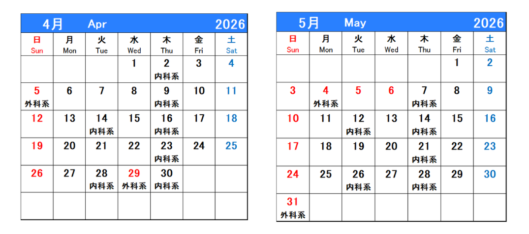 時間外で当院が救急担当している曜日については、下表をご確認ください。